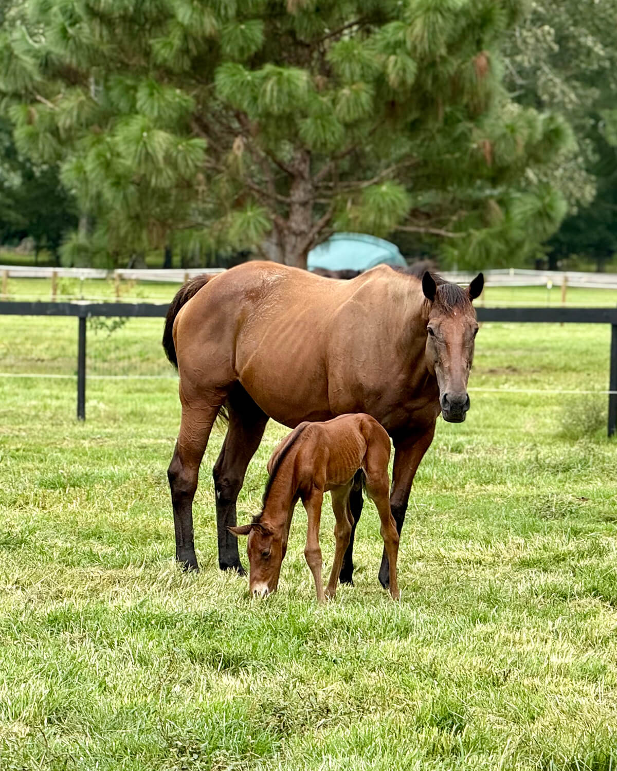 Our story, Lady: I made a bad decision to purchase an OTTB sight unseen as an adult amateur that had been out of riding for several years. It was always a childhood dream of mine to retrain a racehorse, so when the opportunity presented itself, I went for it without thinking it through. I didn’t know much of her history except the man who claimed from the track intended to breed her, but never got around to it. He was thinning his herd and was going to send her to Mexico. Lady came to me underweight with a dull coat and overgrown feet riddled with white line disease. We spent the first year getting to know each other on the ground, but I had no clue what true ground work was. I was able to teach her to cross tie and stand calmly. When we started riding, we didn’t have an issues until I tried to take up any contact or ask much. I did some research and through race summaries, finding that she won a few races but was then claimed and put under a different trainer. She then had some sort of incident in the starting gate, never raced well after, and was eventually claimed again by the man I purchased her from. I contacted the first trainer, who remembered her and even sent me a photo of her first race win. He tried to get her back after she was claimed, but was unable. I was not able to contact the second trainer, so had no idea what might have happened to her. The first trainer we tried was not a good fit and made things worse by tying her head down and long lining. She said she “needed to accept being put in the box.” Moving on to another wonderful trainer, we made some progress by letting her find her own box. However, as we progressed she became resistant, tense, and started kicking out. No major physical issues were found with multiple vettings and she had a saddle custom fitted to her. The final straw was an incident in the trailer where she spooked at a loud noise and rushed backwards, cutting her hind foot on the ramp and severing an artery. I found Kelly through a friend and sent her off to Looking Glass Farm. In just 2 months I was riding Lady over teetering bridges. Kelly referred to her as an opportunist and taught me how to direct her before she could take advantage of a situation. This horse is now in Kelly’s Menorcan breeding program and just her first foal this spring!